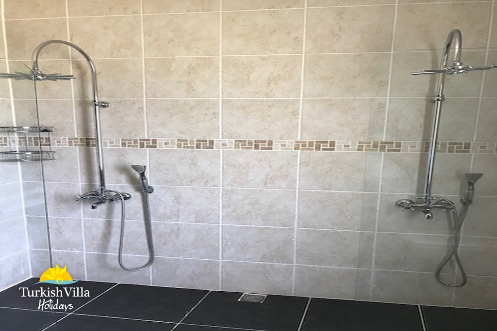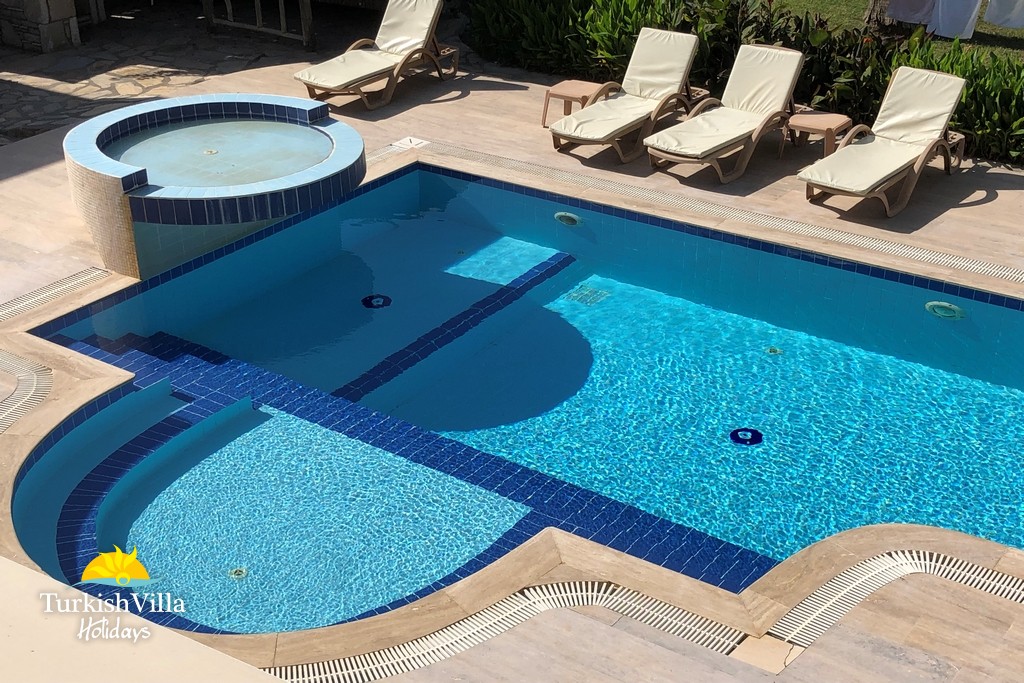 The garden contains a traditional kosk seating area, perfect for shaded daytime relaxing and afternoon naps. There is a stone built BBQ, dining table and chairs, pool shower, sun loungers, parasols and large sun terrace.