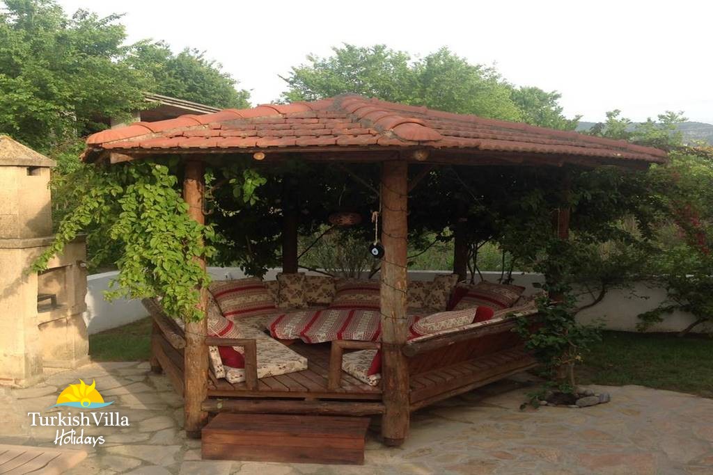 The pool terrace has a stone built BBQ, outdoor furniture and sun loungers. In the garden there is a lovely traditional style kosk with informal cushions, perfect for a relaxing morning or afternoon reading, chatting or napping. The main pool dimensions are approximately 10m x 4m x 2m deep. The shallow area is smaller and approximately 0.5m deep. There is parking outside the villa gates.